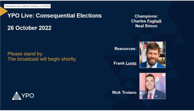 Join the Global Diplomacy Network in this discussion with political pollster and analyst Dr. Frank Luntz. He brings his globally recognized political knowledge and skills to YPOers in this session.